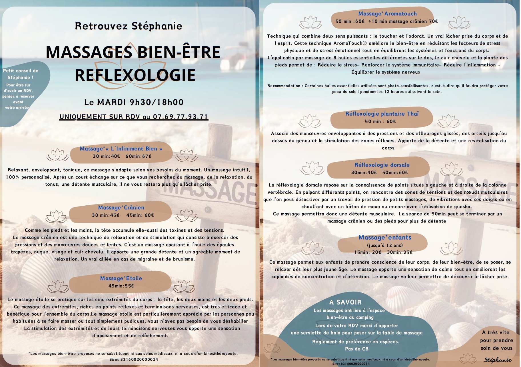 Pendant les vacances sur l’île Oléron, au camping la Boulinière, tous les mardis et jeudis en juillet et août, l’Espace Bien-être est réservé uniquement aux massages (sur rendez-vous). Vous pouvez contacter Stéphanie et réserver l’une des formules proposées. Vous trouverez votre bonheur parmi un large éventail de massages : ciblés sur certaines parties du corps, sur le corps entier, d’une durée plus ou moins longue, et même adaptés aux enfants.